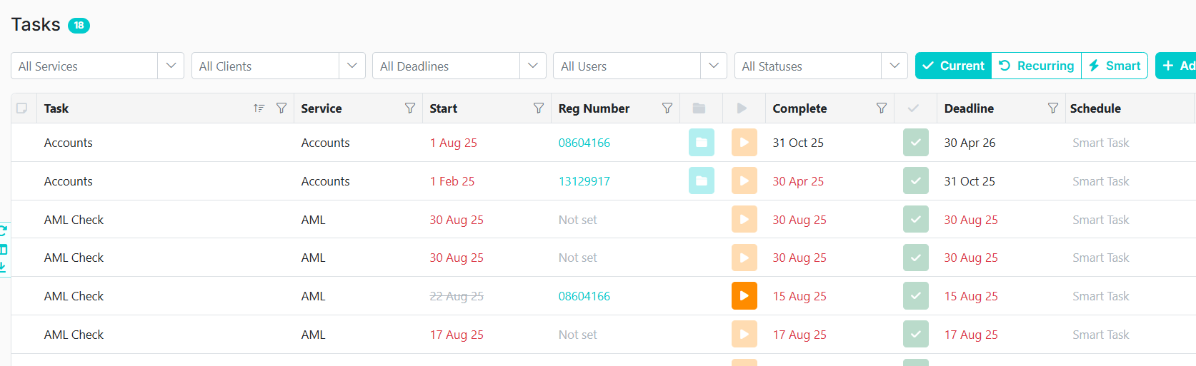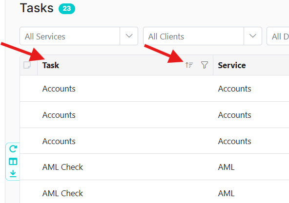 All tasks can be sorted and filtered as required by clicking the relevant column title. e.g. to sort by Task, click the word Task at the top of the column to sort