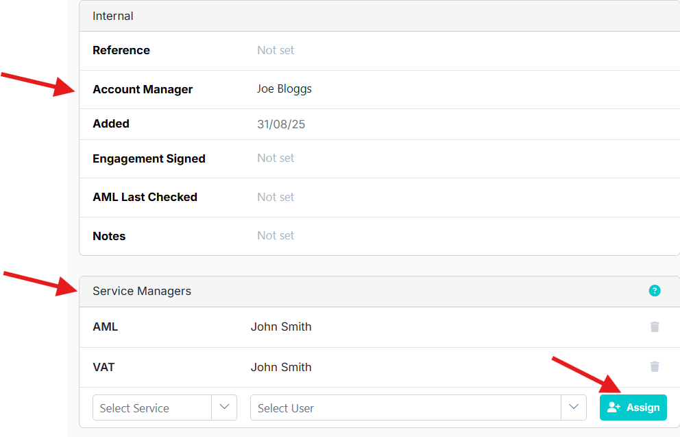 By selecting a client in the Companies or Individuals tabs you can set a service manager for a particular service using the Assign button. The account manager retains overall responsibility for the client with the service manager responsible only for the specifically selected service.