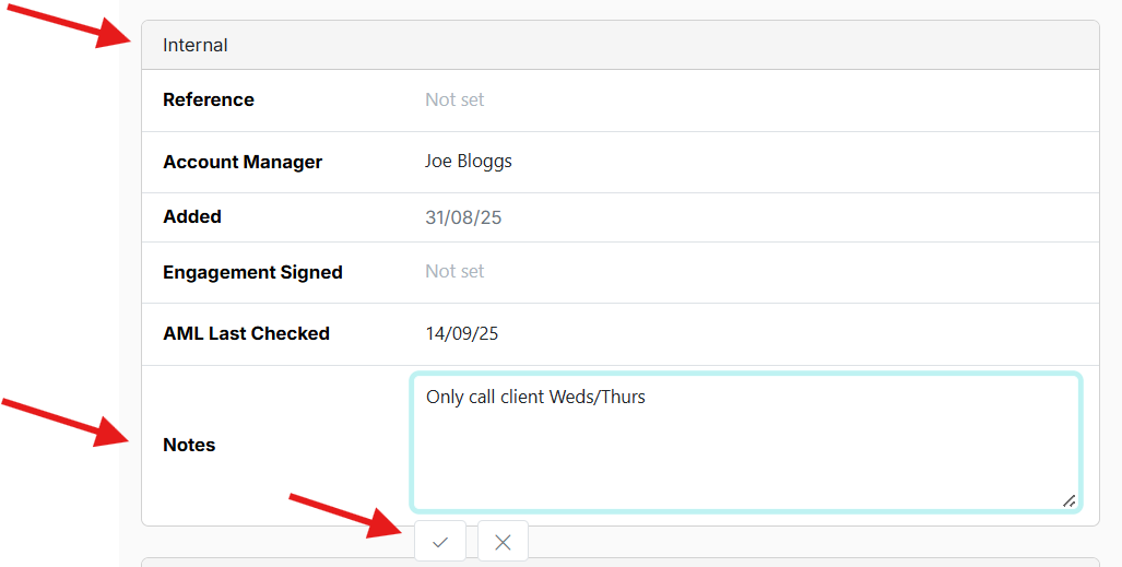 This helps maintain shared context across team members, for example “client only wants calls on Tuesdays” or “sensitive fee discussion underway”.