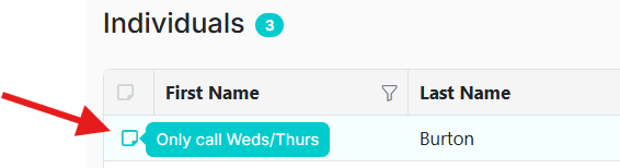 A note icon will appear in the Companies or Individuals list view.